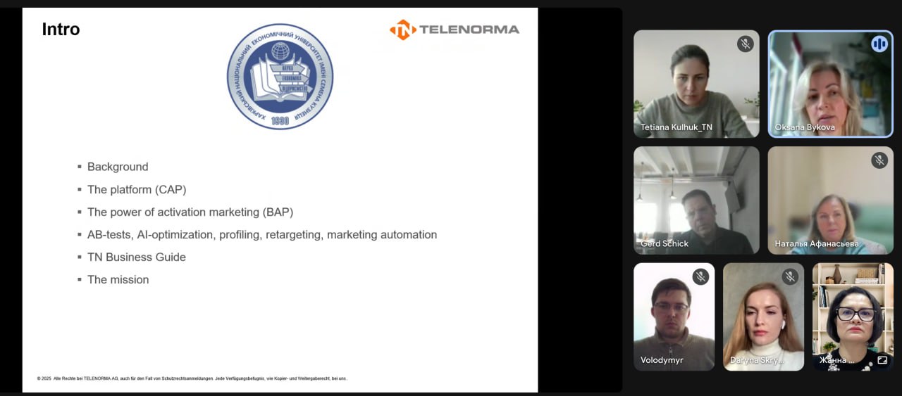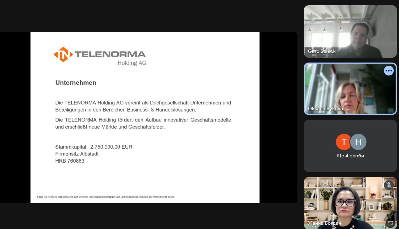 30 жовтня 2025 року кафедра психології і соціології Харківський національний економічний університет імені Семена Кузнеця провела онлайн-зустріч із представниками міжнародної компанії TELENORMA AG (м. Альбштадт, Німеччина), що спеціалізується на інноваційних бізнес-рішеннях, маркетингу, цифрових технологіях та автоматизації бізнес-процесів.