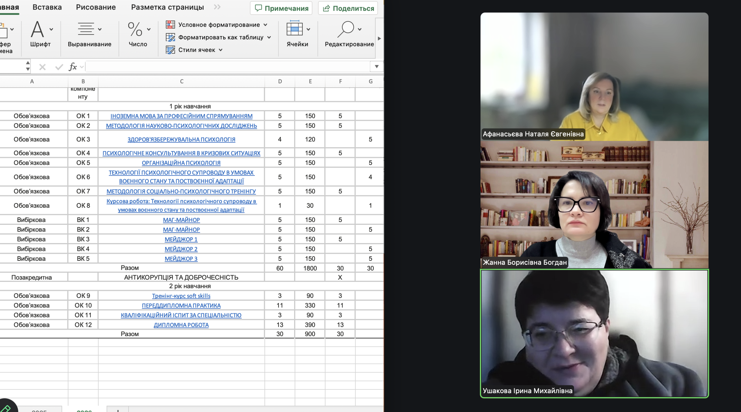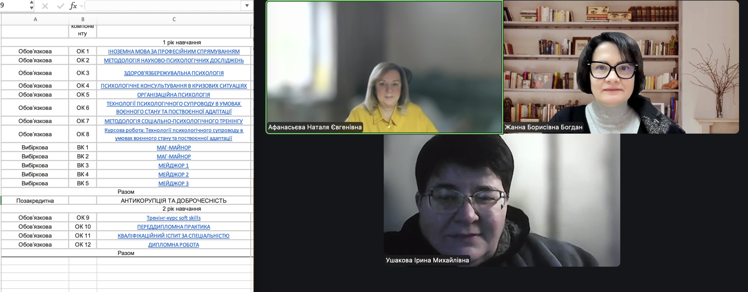 Відбулася робоча зустріч робочої групи з оновлення освітньої програми другого (магістерського) рівня вищої освіти «Психологія», яка має на меті забезпечення подальшого підвищення якості підготовки здобувачів вищої освіти та актуалізації змісту програми відповідно до сучасних вимог професійної підготовки психологів.