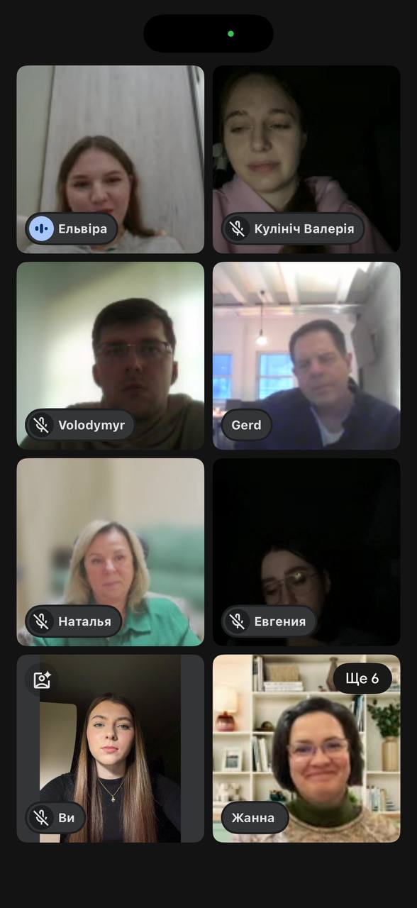 Активну участь в онлайн-зустрічі взяли здобувачі вищої освіти, залучені до навчально-практичної співпраці кафедри з міжнародним партнером., зокрема: Валерія КУЛІНІЧ та Євгенія ГАЛЕЦЬКА, здобувачки другого (магістерського) рівня вищої освіти освітньої програми «Психологія» першого року навчання; Анастасія МАХОНІНА, здобувачка першого (бакалаврського) рівня вищої освіти освітньої програми «Психологія бізнесу» четвертого року навчання; Ельвіра ВІННІК, здобувачка першого (бакалаврського) рівня вищої освіти освітньої програми «Психологія бізнесу» третього року навчання; Вікторія ДОНОШЕНКО, Вероніка ОВСЯННІКОВА та Ілля СОЛОВЕЙ, здобувачі першого (бакалаврського) рівня вищої освіти освітньої програми «Психологія» першого року навчання.