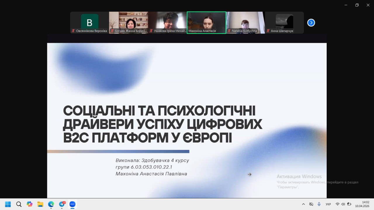 08 квітня 2026 року на кафедрі психології і соціології ХНЕУ ім. С. Кузнеця відбувся захист переддипломної практики здобувачів першого (бакалаврського) рівня вищої освіти спеціальності «Психологія», що тривала з 23 лютого по 04 квітня 2026 року та стала завершальним етапом професійної підготовки здобувачів 4 курсу і важливим кроком до їхнього входження у професійну діяльність.